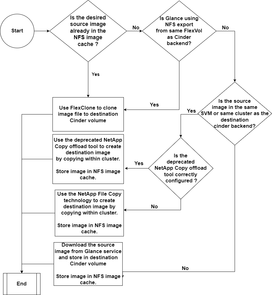 Figure 5.1, “Enhanced Instance Creation with NetApp Copy Offload Tool and File Copy Technology Flowchart” below describes the workflow associated with the Enhanced Instance Cloning capability of the NetApp NFS driver when using the deprecated NetApp Copy Offload or File Copy technology.